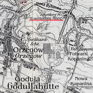 Na tej mapie wcześniej już pokazywanej na czerwono została podkreślona nazwa Szombierski Młyn. Dziś odnosi się jedynie do adresu , bo samego obiektu położonego kiedyś nad Bytomką dawno już nie ma.