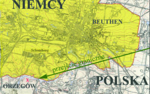 W okresie międzywojennym między Orzegowem , a Szombierkami przebiegała granica polsko -niemiecka.Na mapie czerwowy X oznacza to przejście , które znajdowało się w okolicy wspomnianego tu Szombierskiego Młynu.