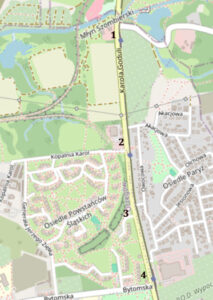 Najlepiej sytuację zobrazować przy pomocy tej mapki. Cyferkami od 1-4 są zaznaczone poszczególne przystanki