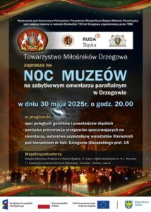 *Głównymi punktami programu ,,Nocy Muzeów” wydarzenia jakie miało miejsce na starej zabytkowej nekropolii były apel poległych górników i powstańców śląskich oraz poetycka prezentacja orzegowian spoczywających na cmentarzu autorstwa uczestników warsztatów literackich pod kierunkiem dr hab. Grzegorza Olszańskiego , który zaszczycił zgromadzonych na naszej nekropolii swoją obecnością.