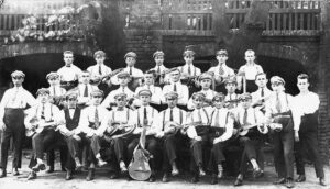 Lata 20.XX wieku . Ogród przy zajeździe ,,Gluck Auf”. W latach 1897 – 1927 obiekt dzierżawili Vincent i Gabriele Proske .Następnym właścicielem był Emanuel Brol. W ogrodzie odbywały się liczne imprezy kulturalne i sportowe. Na zdjęciu zespół gitarzystów i mandolinistów. Siedzą 4.od lewej Paweł Słowik ,a u góry 5. od lewej Edward Musik