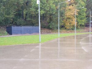 Dzięki zamontowanej estetycznej wiacie śmietnikowej obiekt pozbędzie się  kontenerów na śmieci niezbyt fortunnie ustawionych w okolicy  betonowych stolików do gier planszowych .