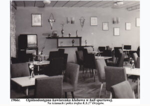 1966r rok. Klimatyczna kawiarenka na górnym piętrze  hali sportowej. Obecnie sala treningowa sportów walki sekcji ogólnosprawnościowej Nelson Club. Uwagę zwraca telewizor i radio  jakie wielu z nas pamięta z tamtych czasów. Na ścianie trofea i pamiątki KS 27 Orzegów . Na jednym z proporczyków widnieje nazwa klubu Bzura Chodaków.